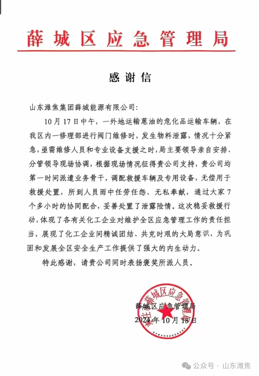 10月17日中午,一外地運(yùn)輸蒽油的?;愤\(yùn)輸車輛,在薛城區(qū)一車輛修理部進(jìn)行閥門維修時(shí),突發(fā)危化品物料泄漏事故,情況十分緊急,薛城能源公司接訊后,派遣業(yè)務(wù)骨干,調(diào)配救援車輛及專用設(shè)備,無償用于救援處置。參加救援人員冒雨操作,任勞任怨、無私奉獻(xiàn),經(jīng)過7個(gè)多小時(shí)的協(xié)同配合、緊急救援,?;沸孤╇U(xiǎn)情成功妥善處置。