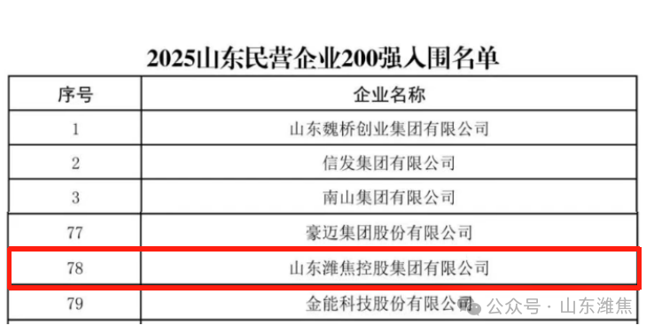 近日,山東省工商聯(lián)、省發(fā)展改革委、省科技廳、省人力資源社會保障廳、省農業(yè)農村廳、省商務廳、省稅務局、省市場監(jiān)管局、省總商會共同組織開展了2025山東民營企業(yè)百強系列榜單發(fā)布活動。山東濰焦控股集團有限公司榮登“2025山東民營企業(yè)200強”第78位。